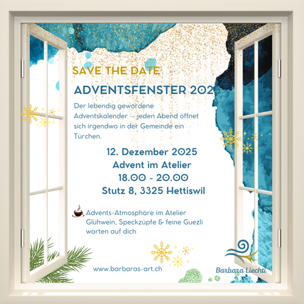 Das Adventsfenster ist wie ein lebendiger Adventskalender – jeden Abend öffnet sich irgendwo im Dorf eine neue Tür. Und am 12. Dezember öffne ich mein Atelier für das Adventsfenster der Gemeinde Krauchthal! 💙
